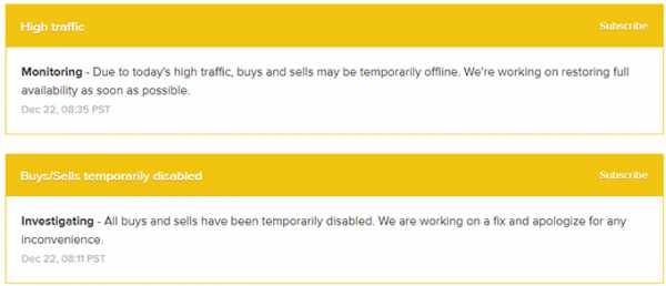 12 декабря биржа прекращала торговлю Litecoin и Ethereum на фоне роста цен на эти криптовалюты. 19 декабря Coinbase объявила о добавлении полной поддержки Bitcoin Cash. Однако вскоре после начала торгов BCH на Coinbase и GDAX они были приостановлены по причине высокой волатильности и подозрительного роста цены.