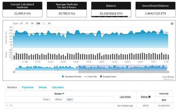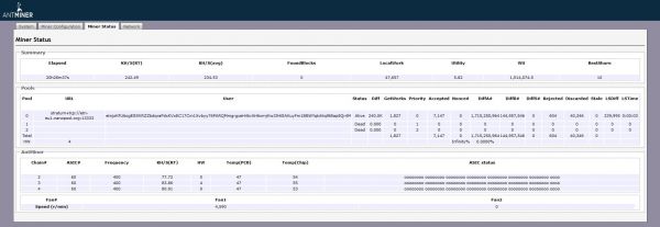 Экспресс-тест с майнингом Electroneum (ETN) через Nanopool, на который возлагались большие надежды, прошёл лучше, но всё равно вызвал сомнения. Майнер подключается и, по-видимому, работает на стороне пула, хотя пул сообщает только о 20 килохешах в секунду вместо положенных 220. Однако майнер, похоже, работает нормально, и локальный хешрейт справляется даже с 235 килохешами в секунду. Есть сообщения об успешном майнинге ETN с помощью ASIC X3 в небольших пулах, хотя стоит отметить, что до хардфорка Electroneum, после которого устройство станет бесполезным для работы с этой монетой, осталось не так много времени.