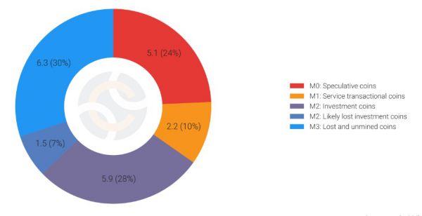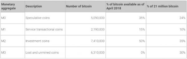 Аналитическая компания Chainalysis провела анализ, в котором применила концепцию денежной массы к биткоину. В анализе все монеты были разделены на принадлежащие инвесторам, спекулянтам (под которыми следует понимать лиц, торгующих деривативами или валютами с высоким риском в обмен на более высокую по сравнению со средней потенциальной прибылью) и сервисам (связанным с биткоин-транзакциями). Также были выделены потерянные биткоины.