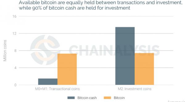 Chainanalysis также утверждает, что большинство криптовалютных энтузиастов используют Bitcoin Cash (BCH) для инвестиционных целей намного чаще, чем для транзакций. Количество BCH, содержащихся в кошельках, в десять раз превышает количество, используемое в транзакциях. Только 1,5 млн. монет BCH используется для проведения спекуляций и транзакций, а остальные (90%) удерживаются как долгосрочные инвестиции. Для сравнения: количество биткоинов, удерживаемых для инвестиций, равно сумме, используемой для транзакций и спекулирования.