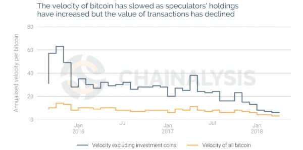 Кроме того, скорость обращения биткоина по обеим определениям денежной массы замедляется с января 2018 года. Средняя скорость с января по апрель 2018 года снизилась до 8,5 на основе только транзакционных и спекулятивных монет и до 4,4 для денежной массы всех доступных биткоинов. Это снижение скорости в 2018 году связано с увеличением краткосрочных спекуляций и снижением объёмов транзакций, поэтому либо экономическая активность для биткоина поднимется (появятся новые варианты использования или новые пользователи), либо эти новые спекулянты непреднамеренно станут ходлерами.