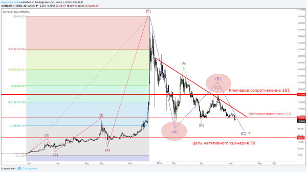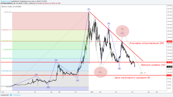 Что касается волновой структуры, то видно развитие движущей волны Y затянувшейся коррекции. Вместе с тем, выход из треугольника может только ускорить развитие волны Y, поэтому следует отметить перспективную цель, куда монета может дойти — это поддержка в районе $80.
