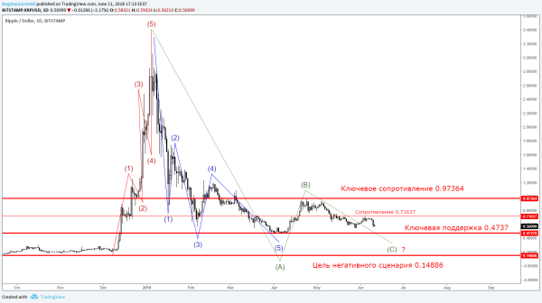 С точки зрения волн Эллиотта формируется внутренняя структура импульса, и в случае пробоя поддержки в районе $0.4737 будет дальнейшее формирование волны С. И напоследок, если новостной фон следующей недели будет давить на ликвидные криптовалюты, тогда риппл не останется позади.