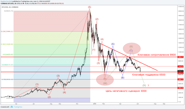 Что касается волновой разметки Эллиотта, то она была пересмотрена в пользу волны Y. Недавнее снижение на более чем 10% сформировало еще одну движущую волну, и только поддержка в районе $6500 пока что служит надежным техническим форпостом, который подкреплен минимальными значениями этого года.