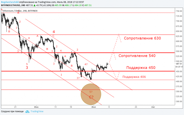 В случае реализации негативного сценария, эфир может протестировать и пробить уровень поддержки в районе $450.