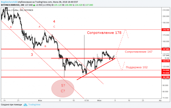Монеро (XMR) после выхода из треугольника немного скорректировался до поддержки на уровне $132. Вместе с тем, еще видна тенденция на рост, поэтому можно ожидать очередного тестирования уровня сопротивления в районе $147. Кроме того, как в случае с другими криптовалютами, пробой важного сопротивления откроет перспективу достижения следующего уровня в районе $178.