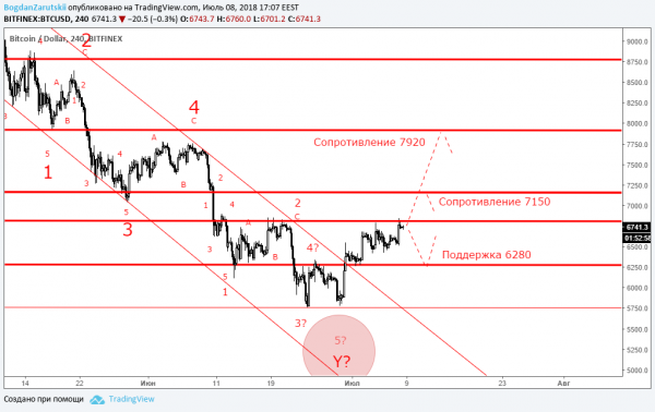 Биткоин (BTC) тестирует важный уровень сопротивления в районе $6837, а это в свою очередь говорит о готовности «цифрового золота» пройти технически важный уровень сопротивления. Поэтому пробой этой отметки даст хороший сигнал быкам покупать биткоин. В случае реализации этого сценария, откроется перспектива достижения следующего уровня в районе $7162. Если и этот уровень будет пройден, тогда цель поднимается до $8000.