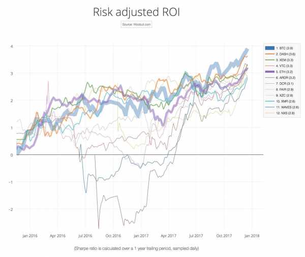 Тезис о том, что среди всех криптовалют у биткоина самый высокий коэффициент Шарпа, находит подтверждение в инфографике, взятой из сайта woobull.com