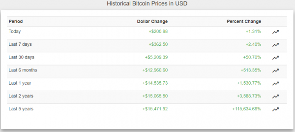 График ниже иллюстрирует, насколько в процентном отношении вырос биткоин за последние полгода, год, два года и пять лет