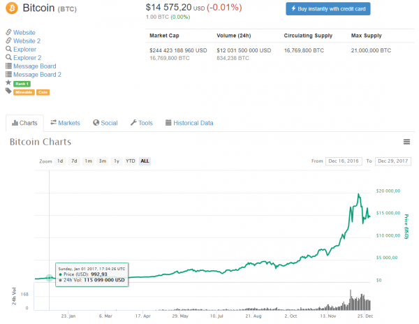 Если в первый день уже уходящего года биткоин впервые с 2013-го преодолел рубеж в $1000, то уже к середине декабря он активно тестировал отметку в $20 000. На момент написания материала (29.12.2017) «цифровое золото» торгуется в районе $14 500 (биржа Bitfinex).