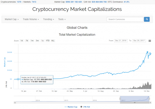 Итак, если в первый день 2017 года общая капитализация рынка криптовалют составляла всего $17.7 млрд, то к 29 декабря этот показатель достиг $592 млрд.