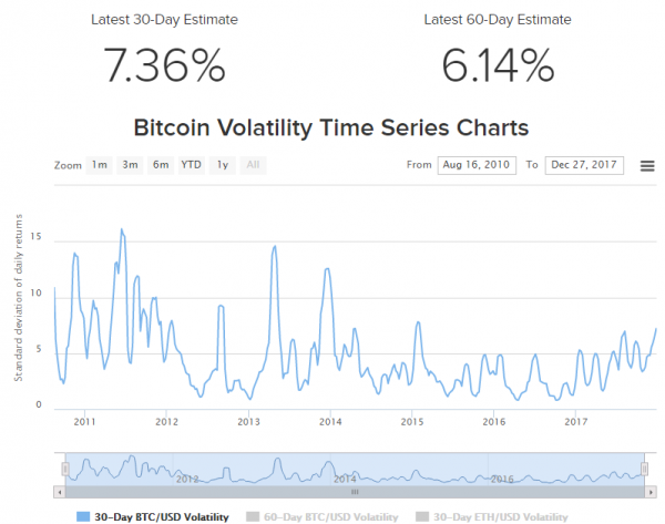 Многие известные экономисты и старожилы финансового рынка ругают биткоин за его высокую волатильность. Однако, изучив следующий график, можно прийти к выводу, что с течением времени средний размах колебаний цены биткоина снижается