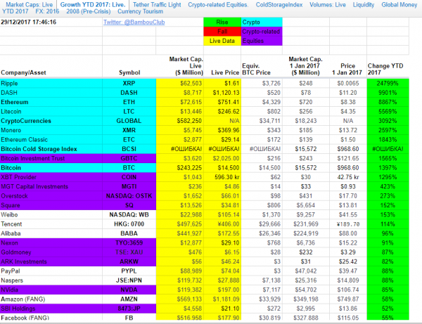 Стоит также отметить интересную деталь — рынок криптовалют в целом (обозначен в таблице, как «CryptoCurrencies») рос активнее биткоина (3092% против 1397%). Также весьма неплохую динамику в 2017 году продемонстрировали Monero и Ethereum Classic.