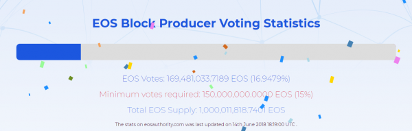 Голосование закончилось около часа назад, и выбранные валидаторы (создатели) блоков уже приступили к выполнению своих обязанностей. Согласно данным ресурса Eosauthority.com, занимающегося подсчетом проголосовавших токенов, на момент публикации проголосовало почти 17% токенов при установленном в протоколе пороге в 15%. Конец голосования ресурс отметил праздничными эффектами. На созданные к текущему моменту 745 тысяч блоков приходится около 78 тысяч транзакций.